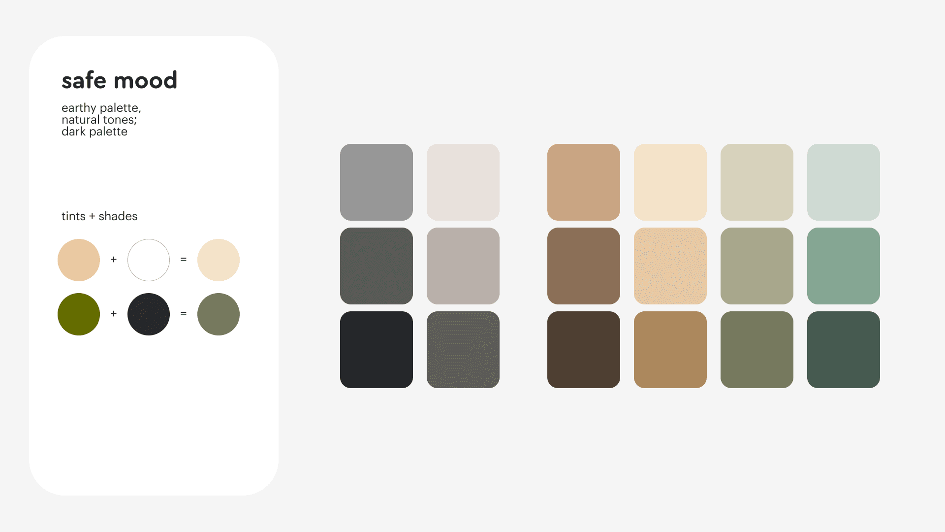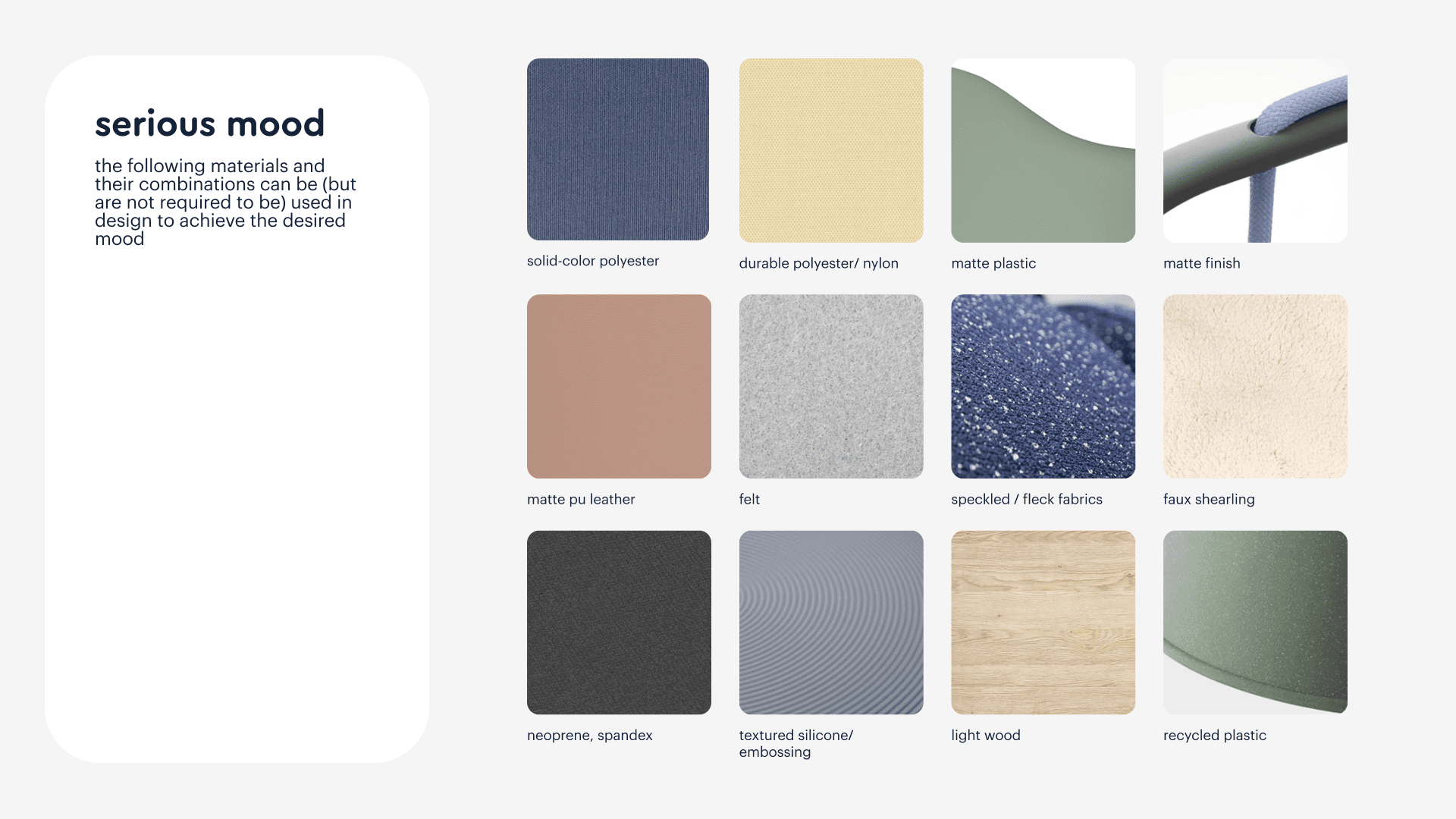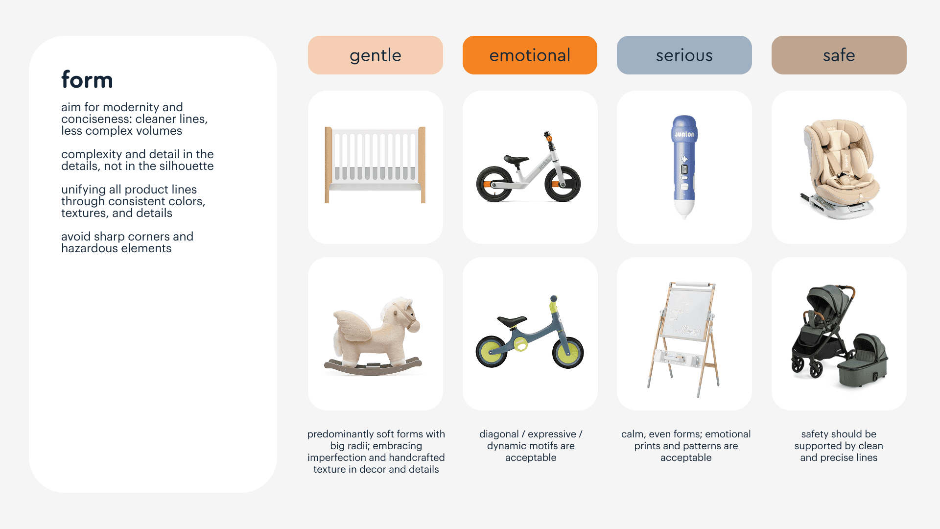 Each mood came with its own toolkit: a color palette, a material palette, textures, patterns, and formal principles. The "safe" mood draws on earthier, muted tones, matte finishes, and clean quilted surfaces — communicating reliability without being clinical. The emotional mood opens up to brighter hues, expressive patterns, and more dynamic forms. The tender mood works in pastels and handmade-feeling details. Each set of tools reinforces the mood rather than decorating it. Across all of them, certain things stay fixed: no visual overload, no aggressive color combinations, no gender-coded design — these were explicit decisions, not defaults.